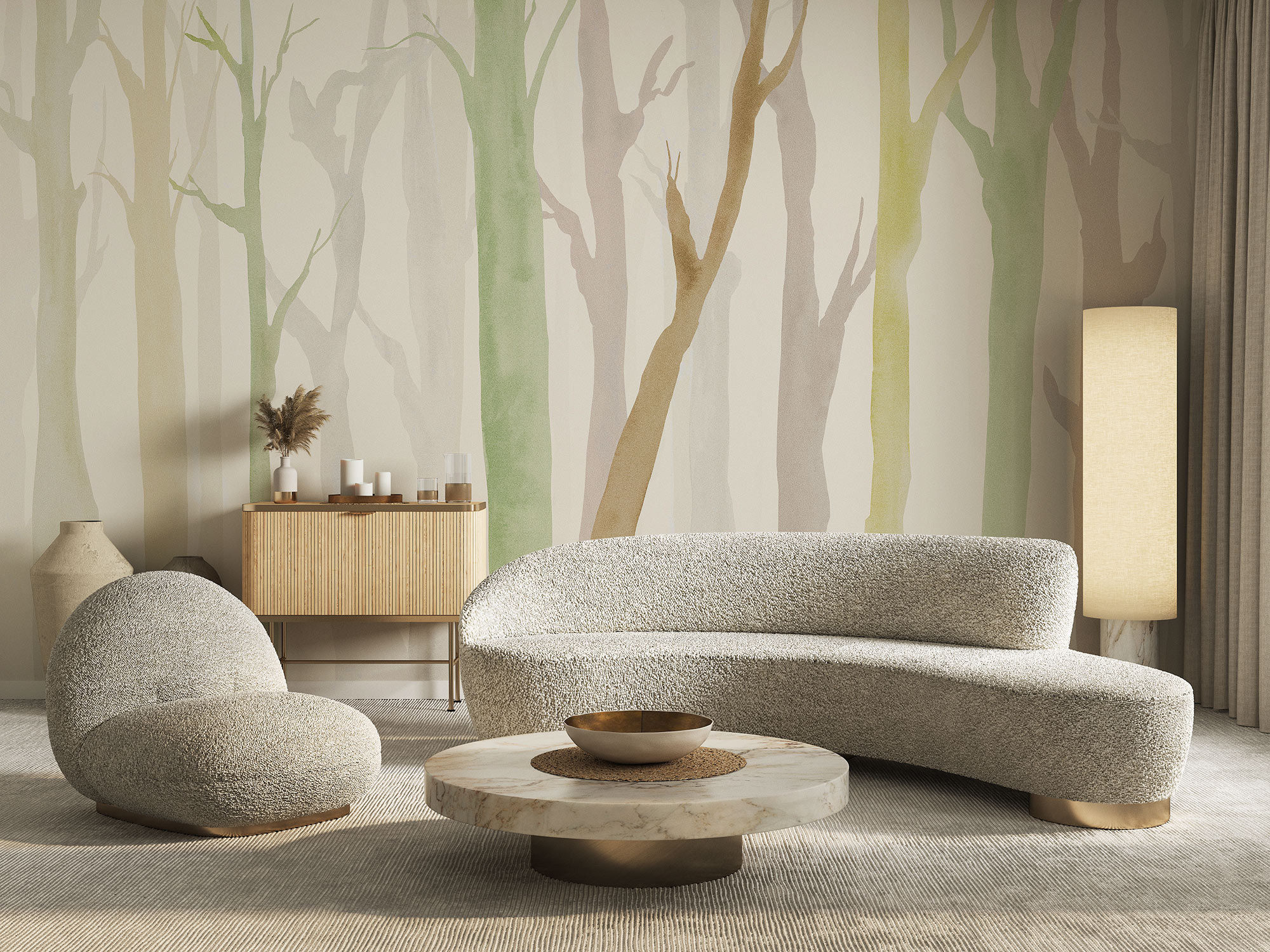 Οι ντελικάτες απεικονίσεις κορμών δέντρων σε απαλά παστέλ χρώματα προσδίδουν στο σαλόνι μια ευχάριστη και χαλαρωτική ατμόσφαιρα. Σε συνδυασμό με ένα μοντέρνο στυλ επίπλωσης, αυτή η διακόσμηση τοίχου δημιουργεί μια ζεστή και φιλόξενη ατμόσφαιρα και η μοντέρνα επιλογή χρωμάτων καθιστά αυτή την φωτοτοιχογραφία ένα κομψό στοιχείο σε κάθε σπίτι.