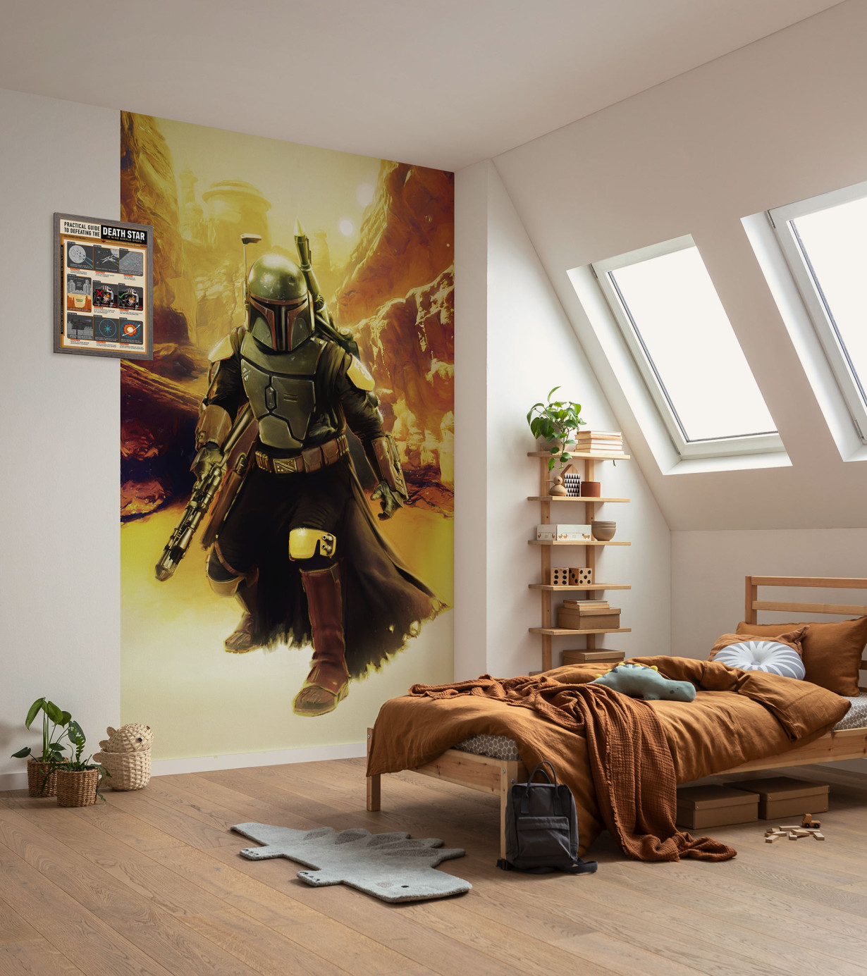 Η μυστικιστική ταπετσαρία του χαρακτήρα του Star Wars, Boba Fett, λάμπει σε έντονες πορτοκαλοκίτρινες αποχρώσεις που ακτινοβολούν ζεστασιά στο δωμάτιο και μεταφέρουν τον θεατή σε έναν άλλο κόσμο.