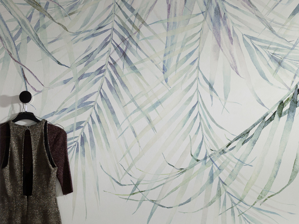 Με αυτήν την τοιχογραφία, είναι εύκολο να φανταστείτε ότι είστε ξαπλωμένοι στο γρασίδι κάτω από φοίνικες, ενώ ακούτε το θρόισμα των φύλλων. Η φωτοτοιχογραφία με φύλλα φοίνικα δημιουργεί μια μεσογειακή ατμόσφαιρα σε κάθε σπίτι.
