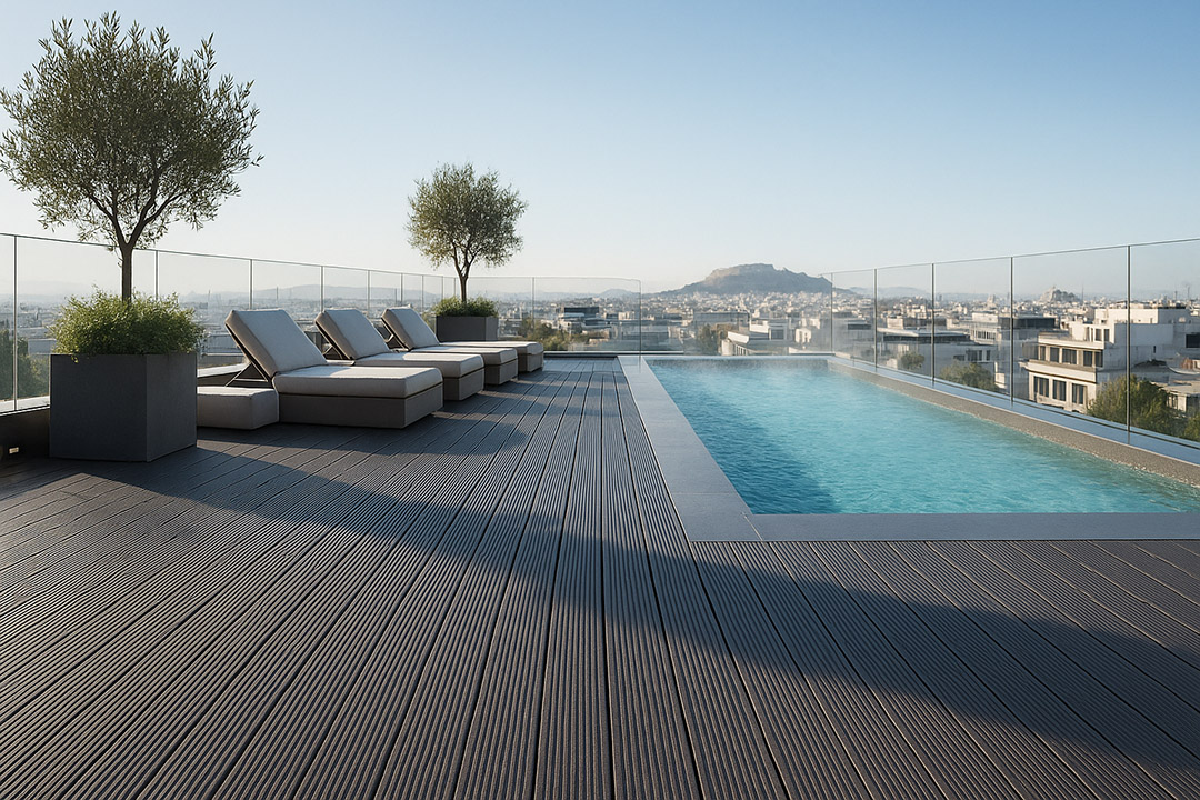 Συνθετικό δάπεδο Deck WPC εξωτερικού χώρου που αποτελείται από 55% ξύλο και 35% HDPE και 10% ρητίνες, UV σταθεροποιητές κλπ. Είναι διπλής όψης με στενό χτένι στη μία όψη και φαρδύ στην άλλη. Ιδανική επιλογή για πάτωμα πισίνας, βεράντας, εξωτερικούς χώρους καταστημάτων, κήπους, μαρίνες κλπ.