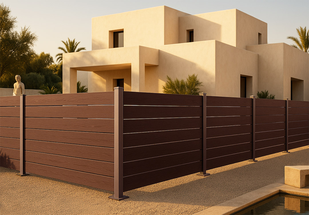 Συνθετικό Deck WPC νέας γενιάς περίφραξης εξωτερικού χώρου που αποτελείται από 55% ξύλο και 35% HDPE και 10% ρητίνες, UV σταθεροποιητές κλπ. Είναι διπλής όψης με ανάγλυφα 3D νερά ξύλου. Η περίφραξη με WPC έχει προσιτή τιμή και είναι κατάλληλη για πολλές εφαρμογές όπως περίφραξη οικοπέδου, κήπου ή πισίνας, εξωτερική περίφραξη, επένδυση τοίχου, φράχτη, αυλόπορτας κτλ.