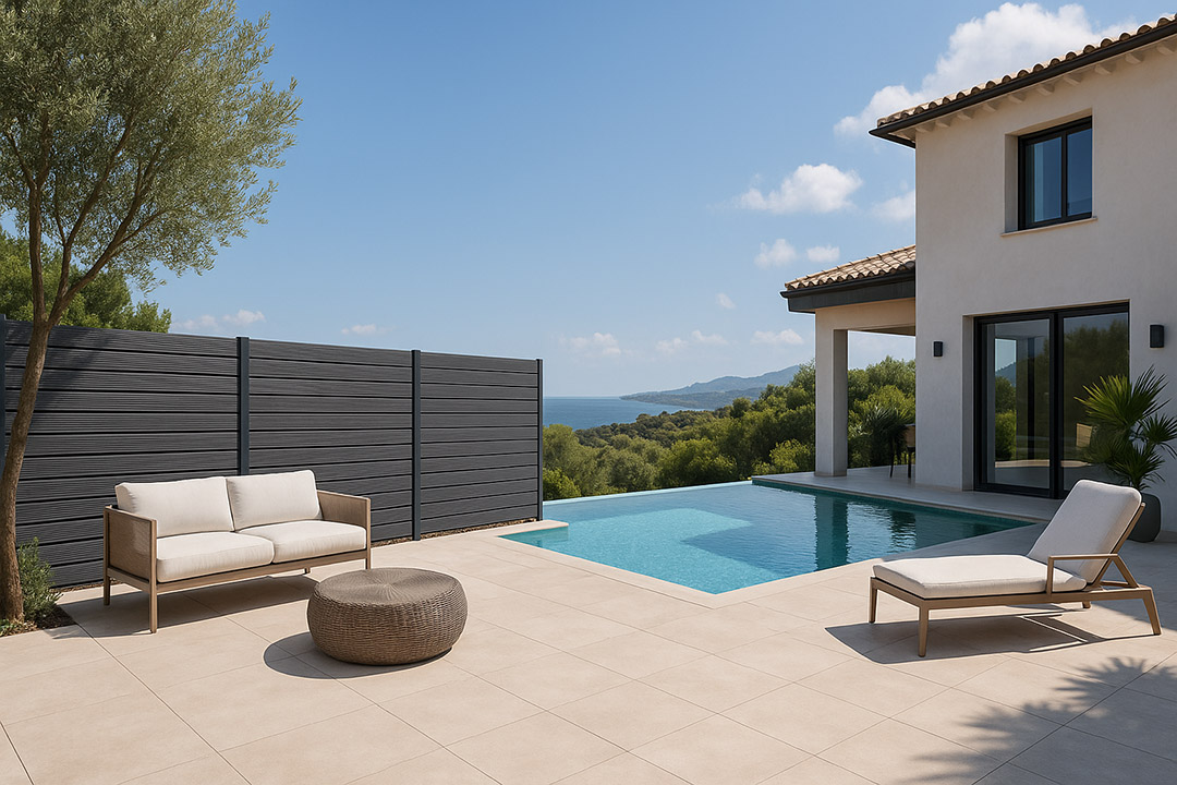 Συνθετικό Deck WPC περίφραξης εξωτερικού χώρου που αποτελείται από 55% ξύλο και 35% HDPE και 10% ρητίνες, UV σταθεροποιητές κλπ. Είναι διπλής όψης με στενό χτένι στη μία όψη και φαρδύ στην άλλη. Η περίφραξη με WPC έχει προσιτή τιμή και είναι κατάλληλη για πολλές εφαρμογές όπως περίφραξη οικοπέδου, κήπου ή πισίνας, εξωτερική περίφραξη, επένδυση τοίχου, φράχτη, αυλόπορτας κτλ.