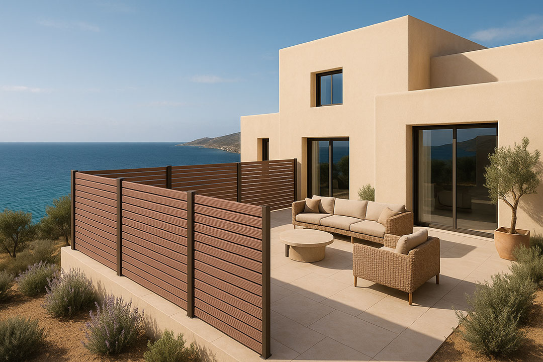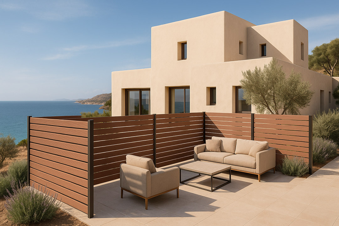 Συνθετικό Deck WPC περίφραξης εξωτερικού χώρου που αποτελείται από 55% ξύλο και 35% HDPE και 10% ρητίνες, UV σταθεροποιητές κλπ. Είναι διπλής όψης με στενό χτένι στη μία όψη και φαρδύ στην άλλη. Η περίφραξη με WPC έχει προσιτή τιμή και είναι κατάλληλη για πολλές εφαρμογές όπως περίφραξη οικοπέδου, κήπου ή πισίνας, εξωτερική περίφραξη, επένδυση τοίχου, φράχτη, αυλόπορτας κτλ.